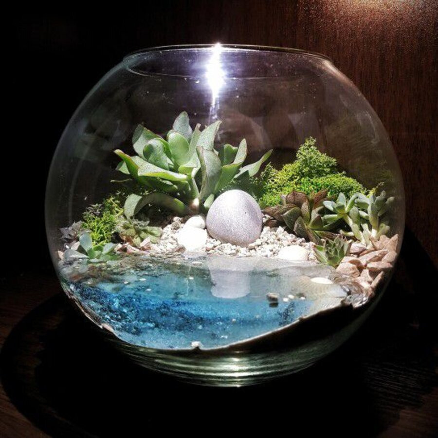 Добавление светящегося водоема во флорариум придает магический оттенок. Красивые игры света на фоне растений создают эффект, вносящий нотку загадочности в интерьер.